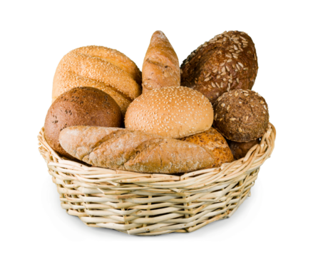 A variety of bakery items are arranged to emphasize the variety, including breads and croissants, displayed warmly and deliciously on a transparent background.