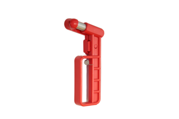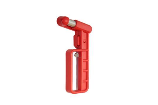 Hammer window glass breaker on the train, tram, bus and car, isolated on white background. Red safety glass hammer mounting or hanging near the windows for using to break