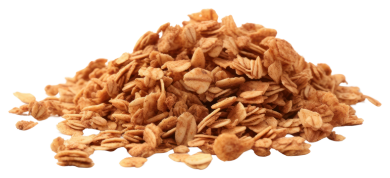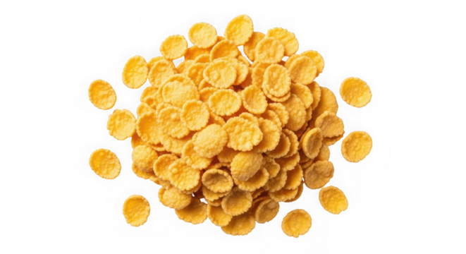 Pile of golden corn flakes isolated on transparent background, breakfast cereal