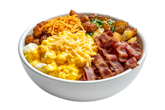 Delicious Breakfast Bowl with Scrambled Eggs Bacon Potatoes and Cheese on transparent background