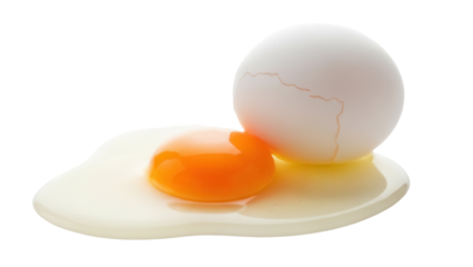 Cracked egg with yolk isolated on transparent background PNG, breakfast ingredient for cooking and baking