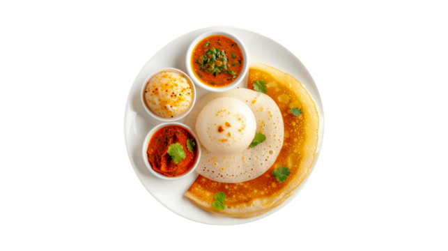 Ghee roast Dosa and Idlii with Chutney, south indian main breakfast isolated on transparent background