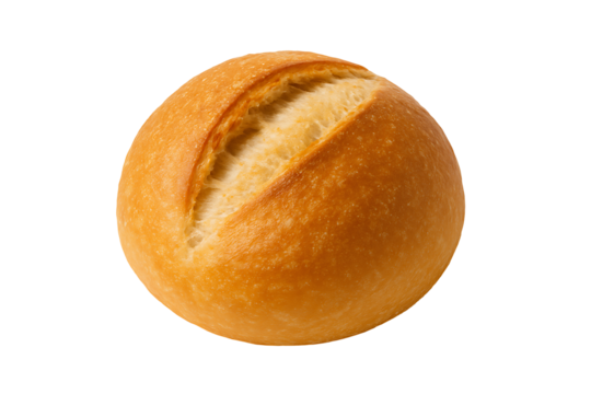 Freshly baked round bread roll with golden crust isolated on white background showing soft texture bakery food item perfect for breakfast sandwich or restaurant menu photography