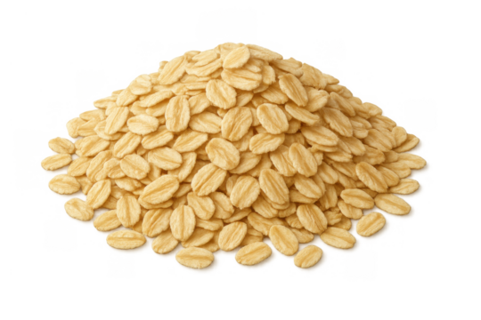 Rolled oats pile on a transparent background, staple breakfast cereal ingredient for healthy eating and baking