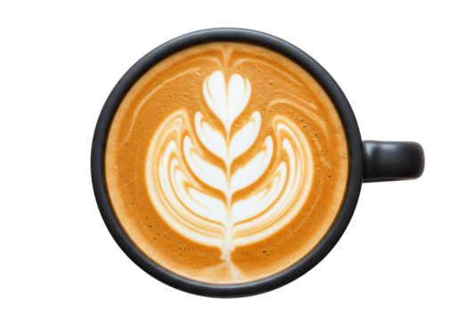 Isolated Cup of Coffee with Latte Art Design on a Table Top Looking Down View