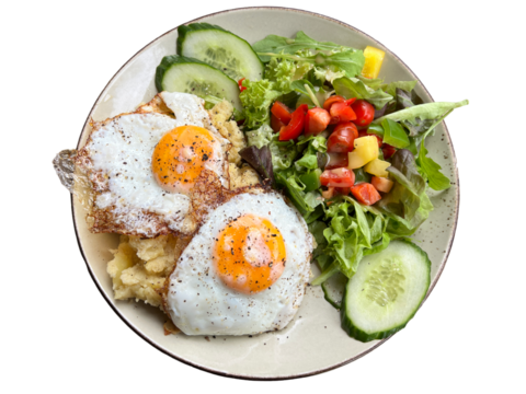 Plate with fried eggs, salad and potato mash isolated on transparency png file