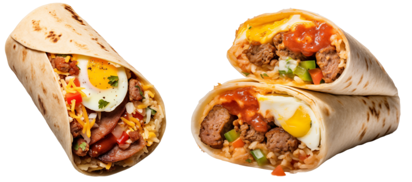 Two breakfast burritos with sausage, eggs, and salsa isolated on transparent background, food bundle
