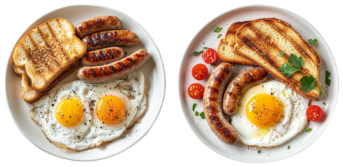 Traditional English breakfast with hash browns, bacon, sausage, baked beans, eggs and cup of tea on transparent background