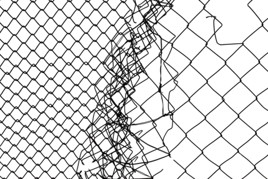 The texture of the metal mesh. Torn, destroyed, broken metal mesh on a white background