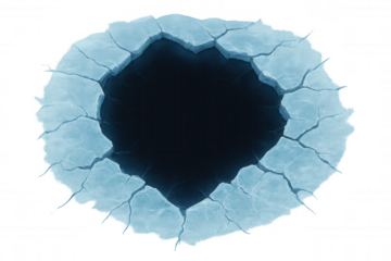 Dark ice cracking, revealing circular water pool against translucent surface, depicting winter's delicate breaking point