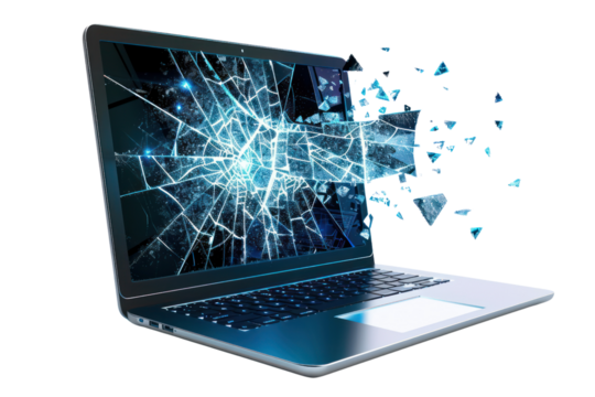Modern laptop with a severely shattered cracked screen displaying bright light patterns isolated on transparent background