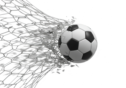 Soccer ball breaking through a net, symbolizing a goal or victory, isolated on transparent background