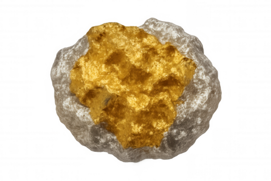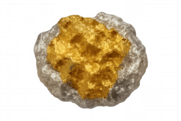 Gold nugget breaking through rock surface, isolated on transparent background, ideal for mineral extraction or wealth concepts