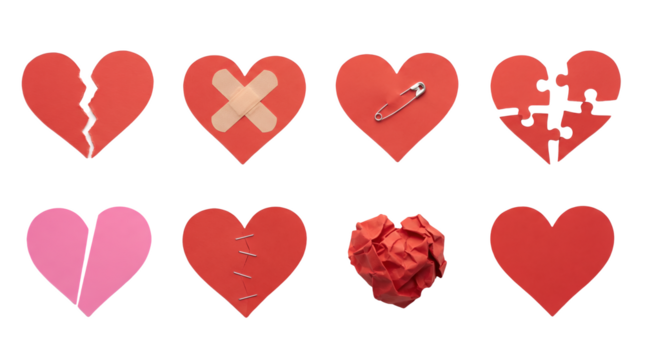 Broken heart set including mended, bandaged, pinned, and puzzled paper heart variants. Emotional recovery and relationship repair collection.