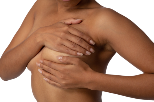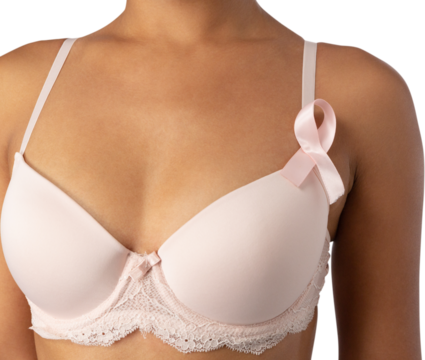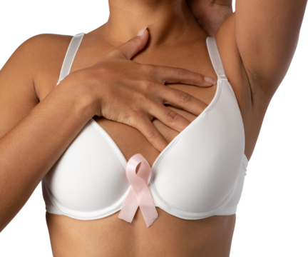 Woman holding breast with pink ribbon symbolizing cancer awareness transparent background