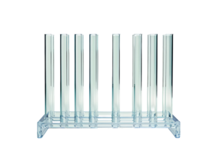 Sterile clear plastic test tube rack holding a row of elongated laboratory vessels prepared for scientific testing or research procedures isolated on black