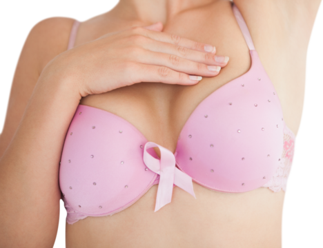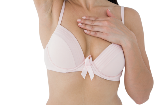 Woman wearing pink bra with breast cancer awareness ribbon transparent background