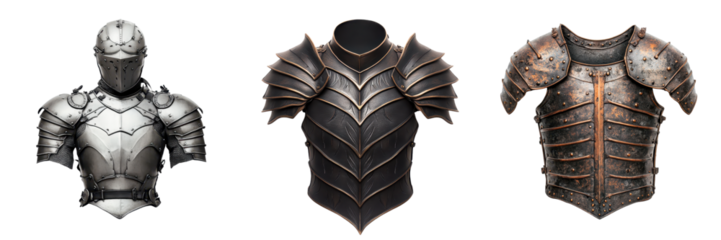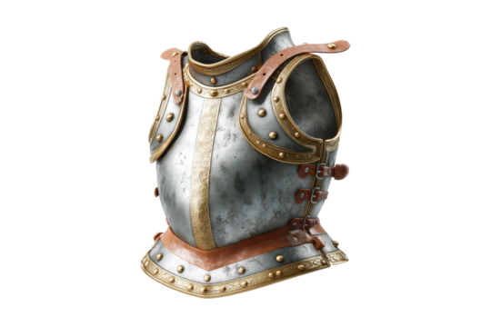 A detailed medieval knights steel breastplate armor with ornate gold accents, isolated on a transparent background
