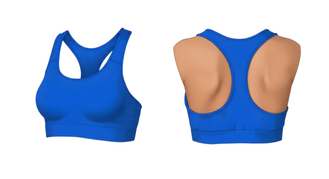 Blue sports bra design showcasing front and back views, ideal for fitness apparel marketing and online retail