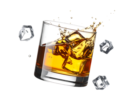琥珀色に輝くウイスキーグラスと氷の美しい瞬間|背景なし・透過PNG