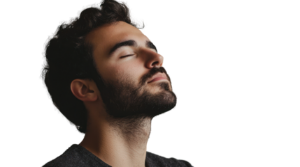 A young man enjoying a moment of peace and serenity, eyes closed, with a relaxed expression on his face, isolated on a white background.