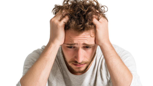 Frustrated young man holding his head, expressing feelings of stress and anxiety against a black background.