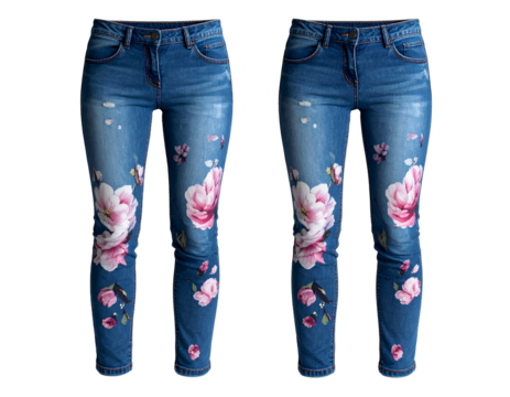 Skinny jeans with flower print on white background