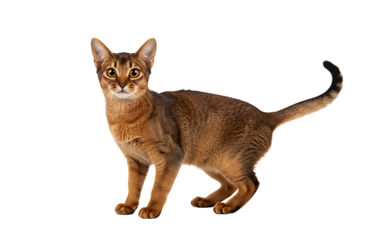 Side profile of an alert Abyssinian cat standing with tail up, isolated on a white background, ideal for pet care branding, veterinary infographics, cat breed identification, and feline-themed designs