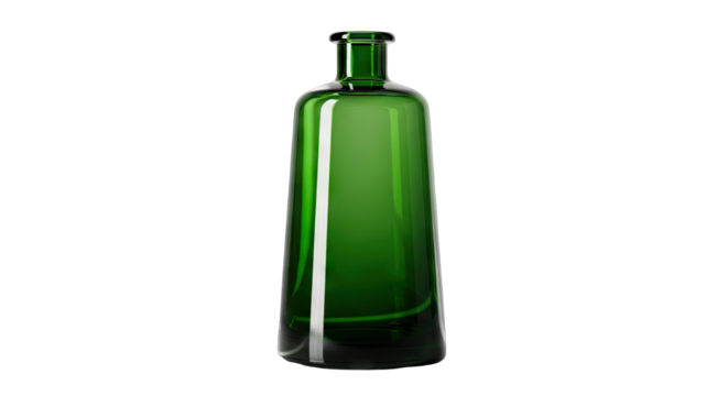 A Tall Green Glass Bottle with a Narrow Neck and a Wide Base on a Transparent Background Illuminated by Soft Studio Lighting