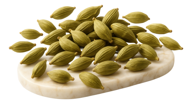 Cardamom seeds scattered on an ivory marble dish for spiced coffee brewing