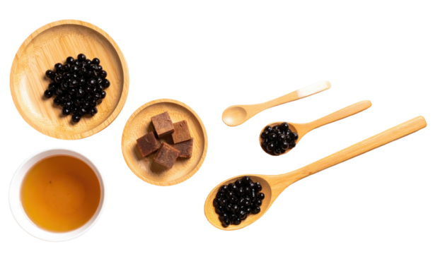 Bubble tea ingredients tapioca, sugar, drink, spoons