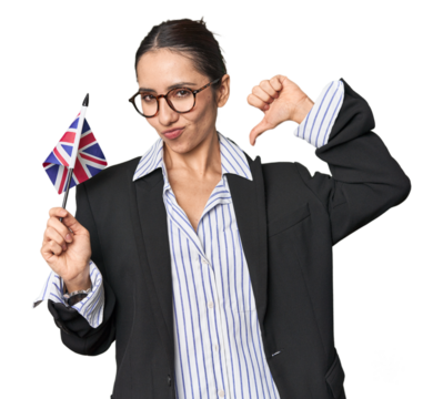 Businesswoman with UK flag, symbolizing international business on studio background feels proud and self confident, example to follow.