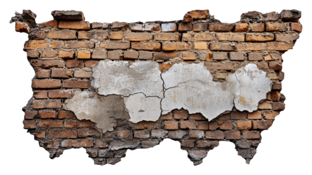 Peeling plaster on exposed brick wall isolated on transparent background