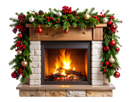 3D Rendered Rustic Fireplace with Festive Pine Garland and Ornaments, Isolated on White