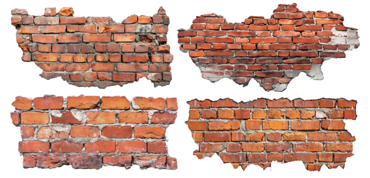 Set of cracked red brick wall fragments, isolated on transparent cutout background