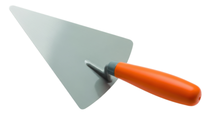 Isolated triangular trowel with orange handle, construction and masonry tool close-up