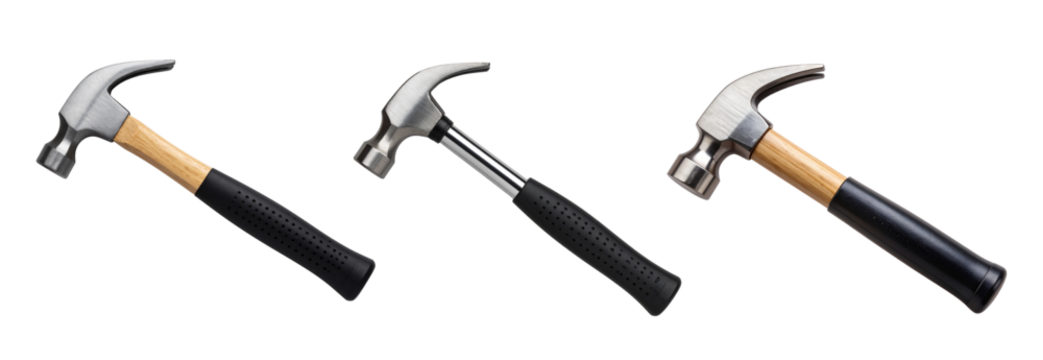 Collection of Studio shot of a claw hammer with wooden handle and black rubber grip, isolated on transparent background