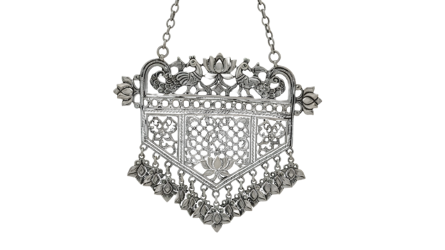 Ornate Silver Peacock Pendant Necklace, Traditional Indian Jewelry with Intricate Filigree Detail