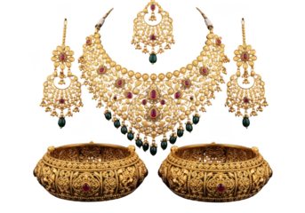 Intricate gold indian bridal jewelry set with earrings and bangles isolated on transparent background