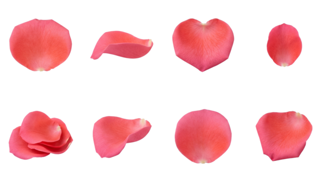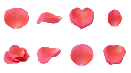 Pink rose petal set including various shapes, curves, and stacked arrangements isolated. Floral elements for wedding and romantic design.