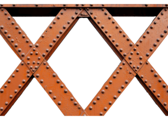 Close up of a riveted steel bridge structure, painted in orange. Engineering and construction concept.