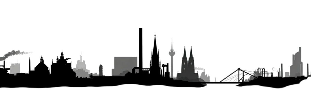 A grayscale depiction of a city skyline with distinct architectural profiles against a dark background