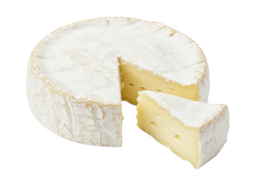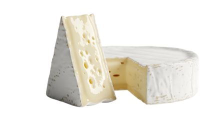A wheel of brie cheese with a slice cut out, isolated on transparent background
