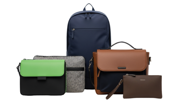 Stylish collection of modern bags; backpacks, briefcases, and clutches in various colors and materials.