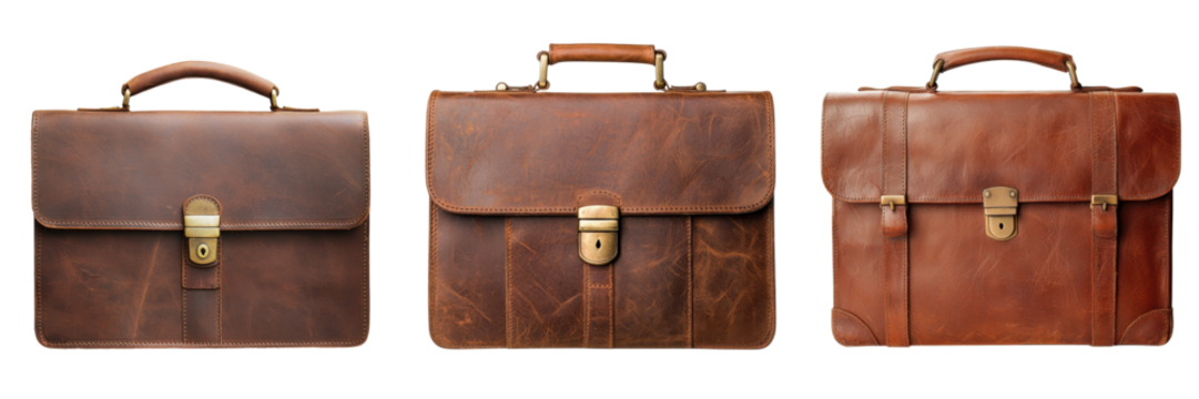 various black leather briefcases on transparent background