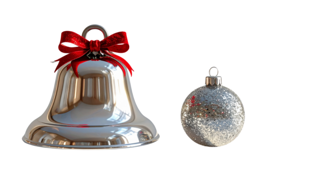 Silver Bells and Red Bow Ornament Duo, isolated on transparent background
