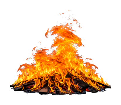 Realistic campfire with burning wood and bright flames isolated on transparent background