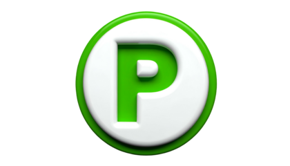 A 3D-rendered, circular badge features a bold white "P" centrally placed within a green border and a white inner circle, set against black