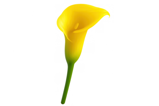 Yellow calla lily blossom with a bright green stem, a symbol of elegance and purity, presented with a transparent background