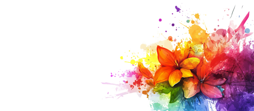 Colorful abstract floral splash with vibrant orange red pink yellow flowers and multicolored paint splatters isolated on a transparent background